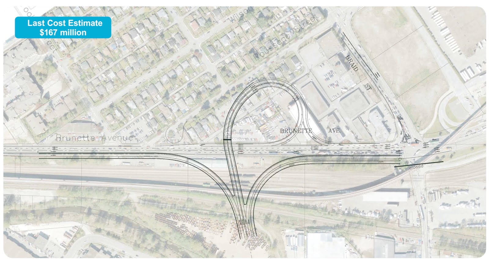 An interesting point of this design is that it will “free up traffic” on Brunette by adding another traffic light, only 150m from the Braid intersection, to allow traffic off the loop to turn onto Brunette. If the whole idea is to end stop-and-go traffic and keep the trucks a-rollin’: this is a non-starter.