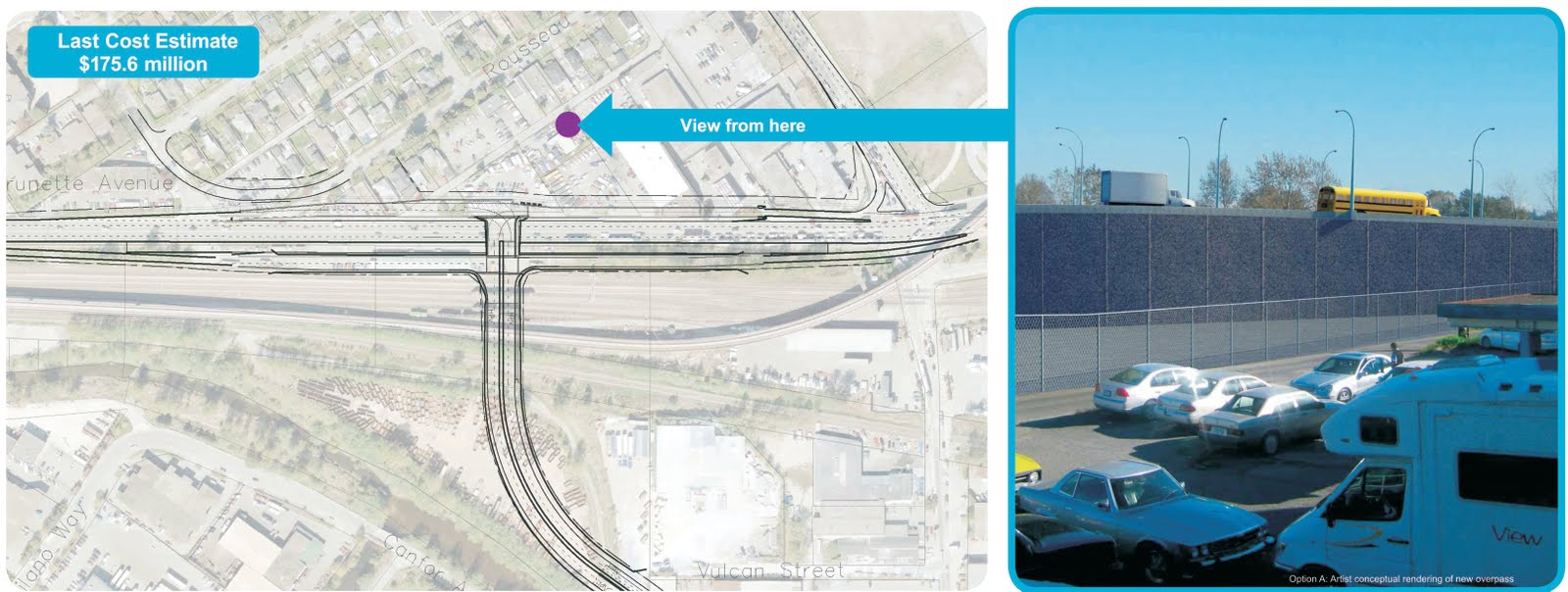 Description: This includes a 2-lane loop of similar size as the previous options, but with no less than three overpasses spanning the rails and SkyTrain. This is the one plan for which TransLink did not provide a ground-level viewscape, but it might look something like this: