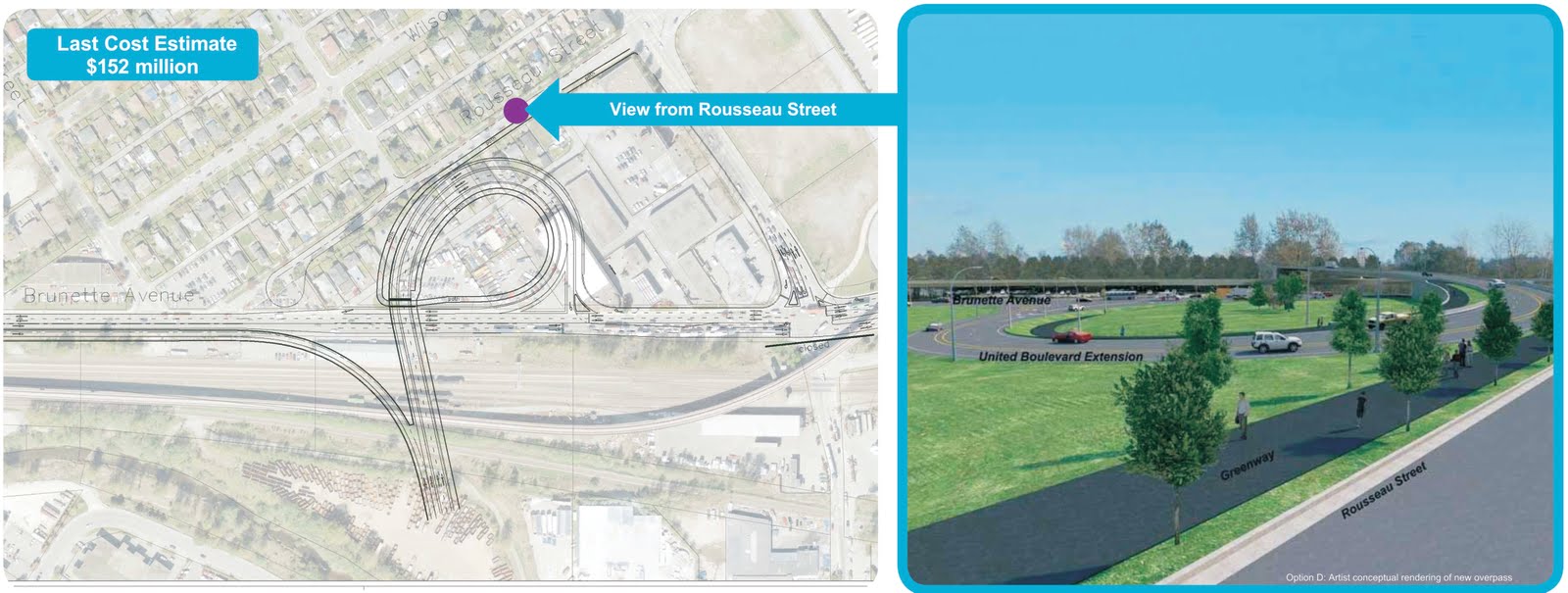 Description: a 3-lane loop, partially elevated to gain elevation over Brunette. The centre lane of the loop has about the same 45m radius as “Option C”, with the tighter downhill lanes on the inside and a single uphill lane. While reducing the impact at the northern end of Rousseau, it will still involve the removal of at least 15 residential and commercial properties on the west side of Brunette, with significant “disruption” to at least a dozen more. Not quite as bad as Option C, but clearly the $700,000 difference will not be made up in the expropriation of a few less properties.