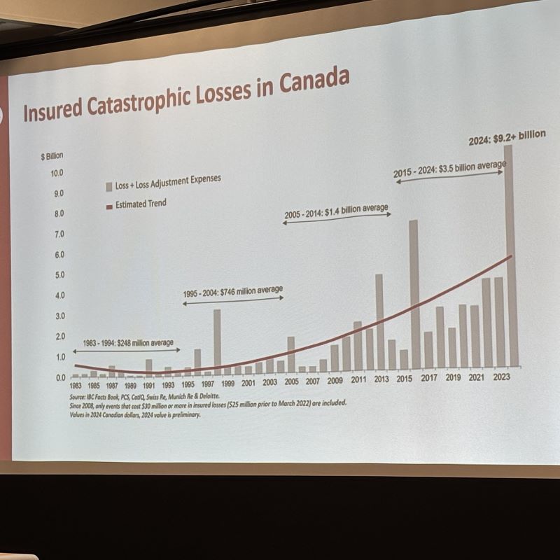Climate Hazards and Housing: we learned about the impacts of climate disruption, with emphasis on the retreat and recover response in Merritt to their atmospheric river flood (with lots of support from the province while the federal government have been shamefully absent), and the ongoing challenges an uncertainties still impacting largely rural Fraser Valley communities as a result of the same flood event. The big take-away from this was the presentation from the Insurance Bureau of Canada explaining how climate-related insurance losses in 2024 exceeded $9 Billion: three times the average over the last decade, and ten times the average form a decade before. You may or not believe that Climate Disruption is a thing, but the Insurance Bureau has the receipts, and your insurance rates tripling in the next few years is a possible outcome of our keeping our national head in the sand about this. But I guess one more pipeline will help pay for this?