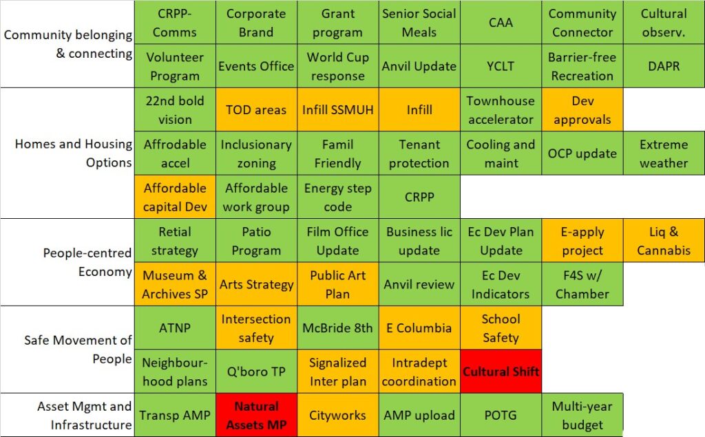 This report is presented as a “traffic light” model, with five priority areas and 71 objectives where a green flag means complete or satisfactory progress made, yellow means “not quite there” and red indicates there are still barriers to completion. The two red areas are completion of a Natural assets Management Plan and Culture Change in Transportation: