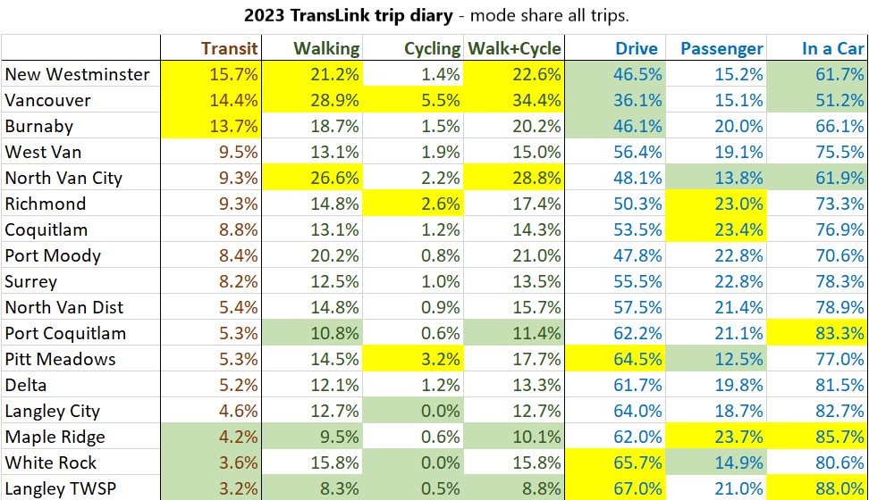 The Trip Diary (2023 results here) is the most comprehensive survey of regional transportation use in the TransLink area. Unlike the census data that only asks folks their most common way of getting to work (or school), the Trip Diary counts all trips over a week, and asks that people report on all modes used, not just their most common mode, and also collects more data about trip distance, municipal-level data, and more.