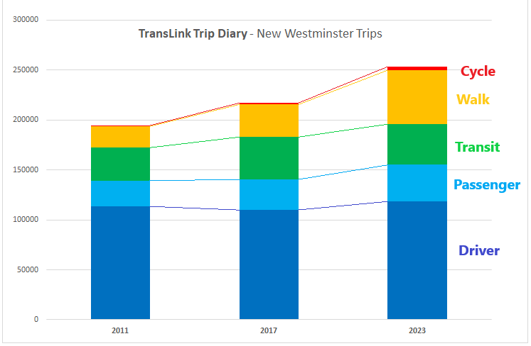 Though population continues to increase in New Westminster (30% between 2011 and 2023), and the number of trips over the same period increased by about the same amount, the headline is that the number of trips as a driver has only gone up 4%, and the driver mode is now less than 50% of all trips. We can now confidently say most New Westies don’t drive for most of their trips. But there is a lot of detail hidden in this chart.